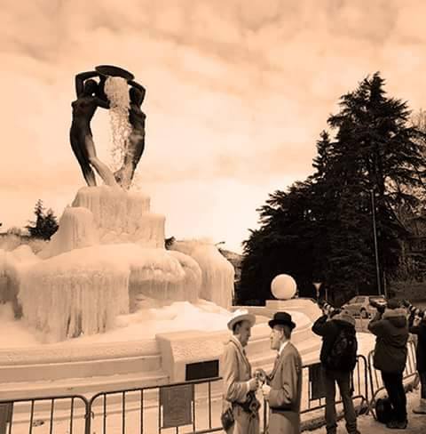 Ma che cos’è che ha trasformato oggi la Fontana che sorge al centro di Piazza Battaglione degli Alpini, nella vera vip del capoluogo di regione? E’ il vestito di ghiaccio che da sei giorni la ricopre quasi completamente e che cambia colore e aspetto a seconda della luce del sole e del gioco di colori prodotto dalla particolare illuminazione voluta dal Comune e che crea tricromie speciali.
