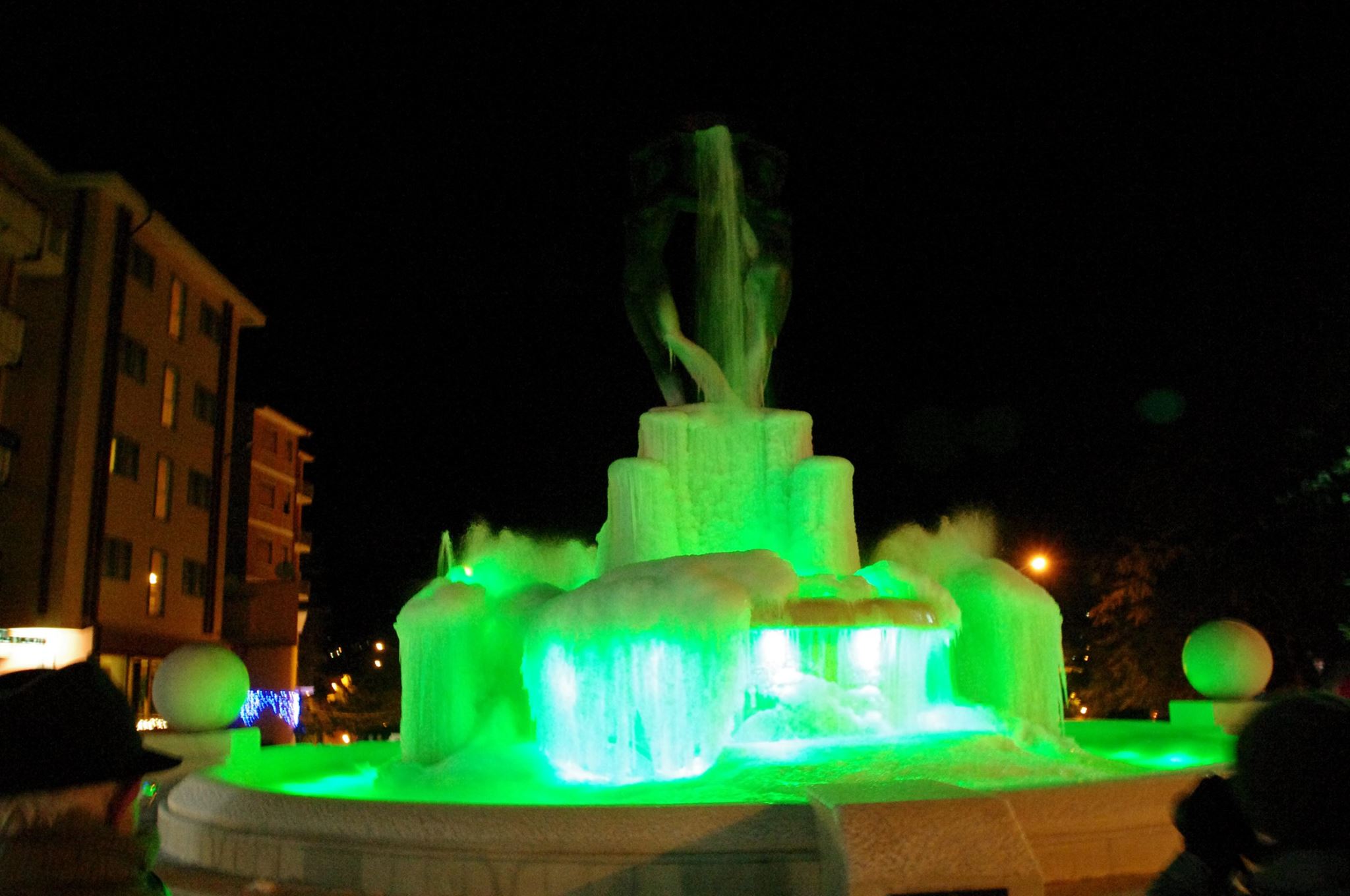 Ma che cos’è che ha trasformato oggi la Fontana che sorge al centro di Piazza Battaglione degli Alpini, nella vera vip del capoluogo di regione? E’ il vestito di ghiaccio che da sei giorni la ricopre quasi completamente e che cambia colore e aspetto a seconda della luce del sole e del gioco di colori prodotto dalla particolare illuminazione voluta dal Comune e che crea tricromie speciali.