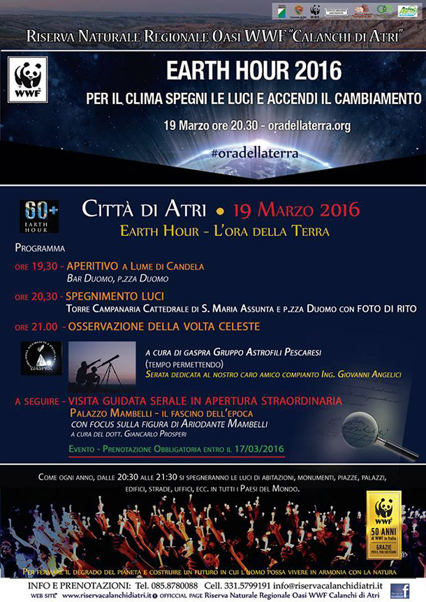 Tra le tante proposte, quella dell’Area Marina Protetta Torre del Cerrano che, oltre a spegnere la propria illuminazione, organizza per domenica 20 una visita guidata sulle orme del fratino, l’uccellino a rischio di estinzione tornato a nidificare lungo le dune locali. Durante la visita le guide daranno informazioni sulle sue caratteristiche e sull’importanza della presenza del fratino, ritenuto un prezioso indicatore biologico degli ambienti dunali del litorale abruzzese. Alle 10.30 cominceranno la visite al fortilizio medioevale e al Museo del Mare. All’iniziativa del WWF “Earth Hour–l’Ora della Terra” aderiscono anche i Comuni di Atri, Silvi e Pineto. L’evento simboleggia la mobilitazione globale contro il cambiamento climatico. Il 19 marzo, per tutta la notte, saranno spente la Torre di Cerrano e Villa Filiani a Pineto, gli archi di Silvi Alta e la torre campanaria del Duomo di Atri. L’Earth Hour è il più grande evento mondiale del Wwf contro il cambiamento climatico: le luci si spengono per un’ora, dalle ore 20.30 alle 21.30, dal Pacifico alle coste atlantiche, dall’Opera House di Sydney alla Torre Eiffel di Parigi, fino alla Basilica di San Pietro. All’evento partecipano i principali monumenti del pianeta.
