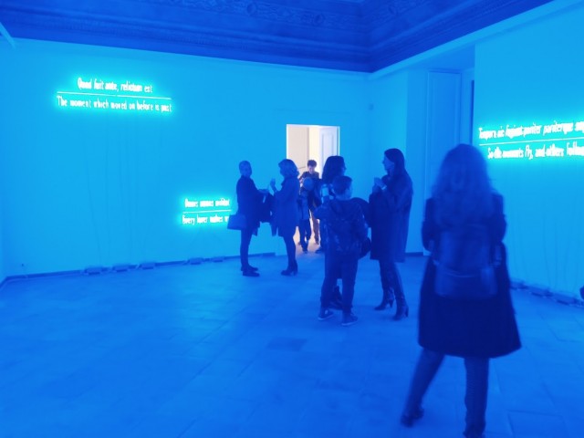 La mostra di Pescara, accolta dai visitatori con interesse e curiosità, è stata impreziosita dalla presenza dell’artista, Joseph Kosuth, che si è palesato a Vistamare intorno alle 19.30. Le scritte in inglese e latino, sistemate nelle stanze della galleria, illuminate ognuna con colori diversi, sono da considerarsi anche come opere singole e indipendenti. Kosuth, che è artista concettuale, si è soavemente “impossessato” della parole estrapolate da Ovidio e le ha “appese” come altrettanti concetti alle pareti della galleria. La dominate di luce differente per ogni stanza si presenta come una ulteriore sottolineatura dei concetti.