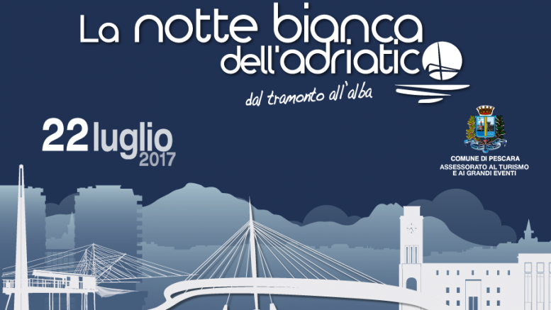 La Notte Bianca dell’Adriatico è in programma a Pescara sabato 22 luglio 2017. Quella del 2017 sarà la terza edizione di uno degli eventi più attesi dell’estate. L’organizzazione della kermesse notturna è dell’assessorato ai Grandi Eventi guidato da Giacomo Cuzzi. Dal pomeriggio fino all’alba di domenica 22 la città sarà animata da spettacoli, concerti e performance di vario genere, anche sportive. Per l’occasione sarà attivato anche un servizio di bus navetta gratuito, ogni 20 minuti, da e per i principali parcheggi della città, anche questi tutti gratuiti per l’evento. Gli uomini impegnati per la sicurezza saranno circa 300, massima la collaborazione tra forze dell’ordine, Misericordia, Pescara parcheggi, Tua e Polizia municipale.