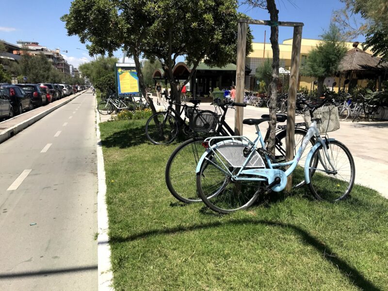 Detto questo, ci è capitato negli ultimi weekend di fare una ricognizione sul lungo mare nord e sud e abbiamo notato una marea di biciclette, stalli stracolmi e tante due ruote attaccate ai pali della segnaletica stradale, dei pannelli pubblicitari, dell’illuminazione, agli alberi. Uno scenario sicuramente disdicevole, di basso decoro urbano, non c’è che dire, ma che trasmette un chiaro segnale: più parcheggi alle bici!!!Lungo la strada il decoro è ormai perso nella notte dei tempi, perché non ci si venga a dire che le auto, ancorché ordinatamente in sosta, facciano di una strada una bella strada. Ma per loro non basta mai lo spazio, per cui ecco che si aprono, con ordinari provvedimenti di urgenza, le porte di nuovi territori, come l’ex ENAIP, per poco più di 200 posti (ma quanto è costato?), per non parlare della strada parco, un migliaio di posti che hanno messo sull’altare funzionale dell’accesso agevole e facilitato al mare (sic!), il decoro di una arteria pedonale in fiore.