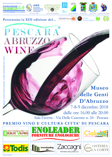 Da ieri fino a domani, 9 dicembre, al Museo delle Genti d’Abruzzo, nella Sala Favetta, in via delle Caserme a Pescara, dalle ore 16.00 alle 20.00, la XIII edizione del Pescara Abruzzo Wine, Premio Vino e Cultura – Città di Pescara 2018.
