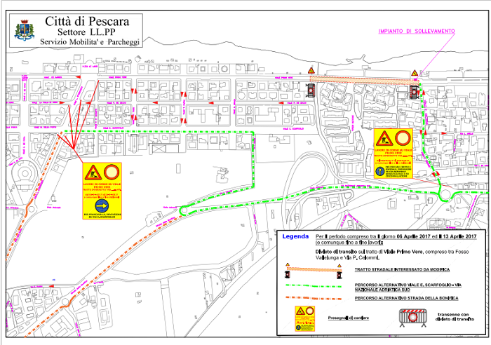 “Indispensabili lavori di manutenzione per evitare che la riviera sud si allaghi, richiedono un nuovo intervento sulla mobilità in accesso a Pescara – così l’assessore alla Mobilità Stefano Civitarese Matteucci – E’ istituito da domani il divieto di transito sul tratto finale di viale Primo Vere, che consentirà di posizionare il tubo di collegamento delle acque piovane alla vasca di raccolta appena realizzata, la cui realizzazione ha già richiesto la limitazione della mobilità a causa dell’invasività dell’operazione. Ora si tratta di collegare la condotta alla vasca e al canale Fosso Vallelunga, che è il fosso di recapito delle acque meteoriche, acque che fino ad oggi non hanno avuto altro sfogo che la strada e che hanno per questo dannosamente allagato la zona. Per tale ragione è necessario limitare ulteriormente il transito durante i lavori di installazione, che si svolgeranno su due distinti settori posti alle estremità del tubo, quali la vasca e il collegamento della rete al canale. E’ indispensabile intervenire subito, per ripristinare la circolazione in entrambi i sensi in tempo per Pasqua. Così come accaduto per via del Circuito, che è stata finita con largo anticipo rispetto ai tempi di lavorazione e grazie anche alla collaborazione della cittadinanza, veglieremo sul cantiere perché accada altrettanto, consentendo ai residenti il passaggio e agevolando in ogni modo possibile i disagi che fisiologicamente scaturiranno dalla lavorazione. Sul posto è già posizionata la cartellonistica, domani ci saranno presidi della Polizia Municipale per indirizzare gli automobilisti verso le direzioni consigliate e limitare al massimo i disagi. Per quanti da nord procedono verso Francavilla, è stata predisposta la deviazione obbligatoria su via Luisa d’Annunzio, peraltro già in vigore e segnalata da due settimane, in questo modo le auto possono procedere lungo via Scarfoglio e proseguire su via Silone e da lì immettersi sulla Statale verso sud e le altre direzioni, bypassando così il cantiere. Per chi arriva via lungomare da Francavilla e procede verso nord, la deviazione è invece in via Celommi verso la vicina Statale, per consentire l’accesso alla Circonvallazione o a via della Bonifica, due arterie che consentono l’ingresso veloce in città. Si tratta di una limitazione temporanea, la chiusura dei lavori è prevista per il 13 aprile, cercheremo, com’è già accaduto in via del Circuito di venire incontro ai residenti e di riaprire al più presto entrambi i sensi di percorrenza. In seguito il cantiere, come già comunicato, andrà avanti fino a maggio, si fermerà durante la stagione balneare lasciando libera la circolazione in entrambi i sensi e riprenderà in autunno per il completamento dell’intervento che consentirà alla zona di risolvere un annoso problema di allagamento su cui da anni si attendevano interventi”.