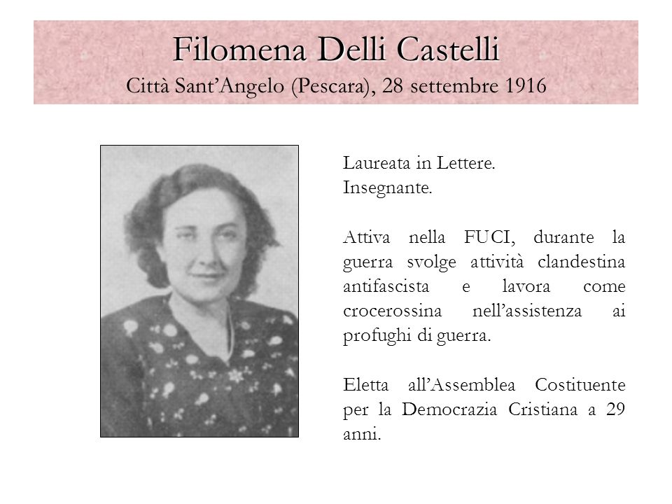 Filomena Delli Castelli, detta “Memena”, nacque a Città S.Angelo e si laureò alla Cattolica di Milano. Tornata in Abruzzo per insegnare, si dedicò anche all’attività politica nella Democrazia Cristiana. Il 2 giugno 1946 venne eletta nell’Assemblea Costituente; due anni dopo divenne parlamentare (nel 1948 e nel 1954) e prima sindaco donna d’Abruzzo (Montesilvano, dal ’49 al ’53). Fece anche parte della Commissione Vigilanza della Rai degli anni Sessanta e contribuì al processo di alfabetizzazione di milioni di italiani con l’ideazione del format televisivo “Non è mai troppo tardi”, condotto dal celebre maestro Alberto Manzi. Filomena Delli Castelli è stata protagonista di numerose battaglie a favore della condizione femminile e della famiglia e ha promosso leggi sul cinema e sugli alloggi popolari.