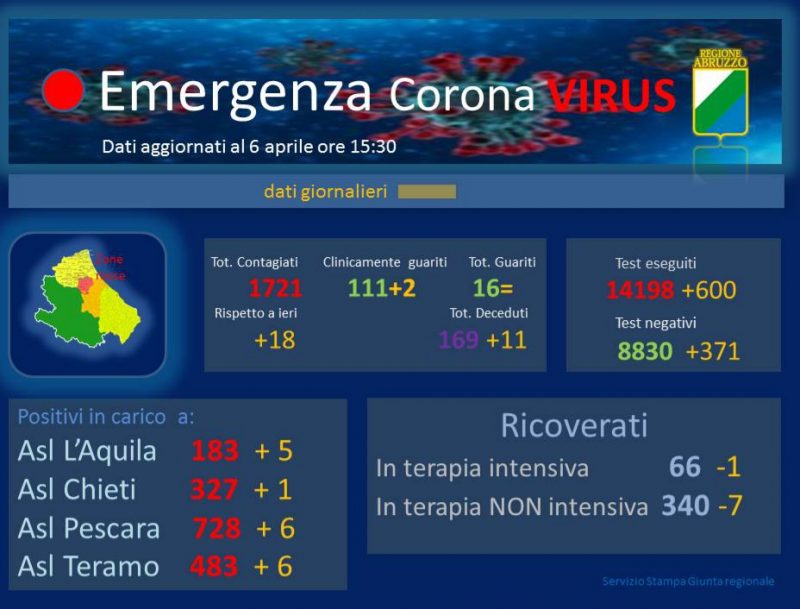 Nel numero dei casi positivi sono compresi anche 169 pazienti deceduti. I nuovi decessi riguardano un 86 enne, una 93 enne una 78 enne ed un 67 enne di Pescara, un 65 enne di Cepagatti, un 92 enne di Teramo, un 79 enne di Silvi, un 78 enne di Montefino, una 88 enne di Castilenti, un 38 enne di Tollo, un 89 enne di Elice. 127 guariti.
