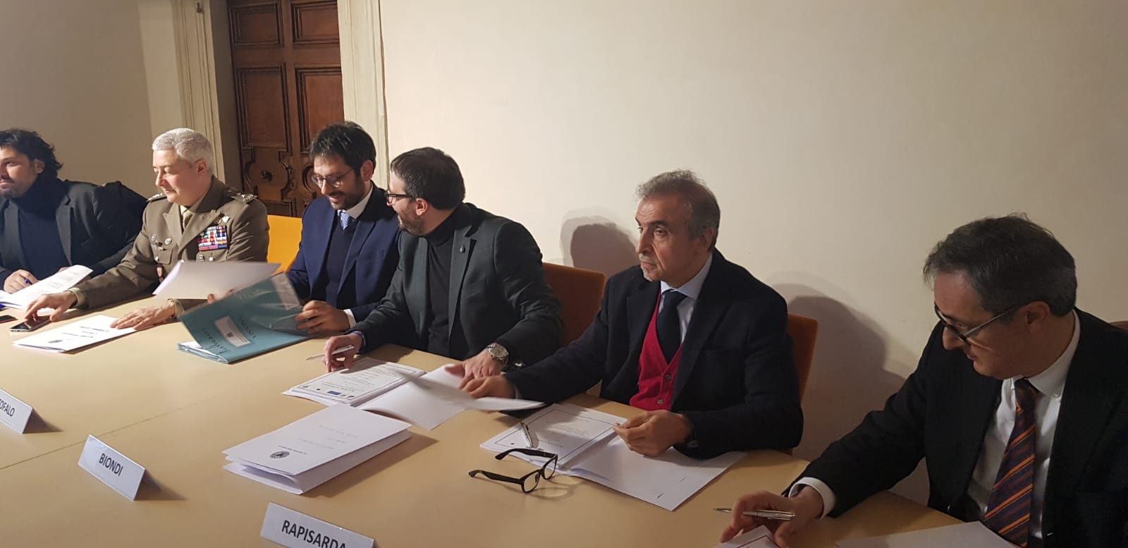 L’intesa è stata firmata dal sindaco dell’Aquila, Pierluigi Biondi, dal generale di divisione Massimo Scala, dal provveditore alle Opere pubbliche Lazio-Abruzzo-Sardegna,Vittorio Rapisarda Federico, dal presidente vicario della Regione Abruzzo, Giovanni Lolli (non presente all’incontro ma rappresentato dal consigliere regionale Pierpaolo Pietrucci), e da Marcello Bosica, vice direttore della Direzione Regionale Abruzzo e Molise dell’agenzia del Demanio. All’incontro è intervenuto anche il sottosegretario alla Difesa Angelo Tofalo.