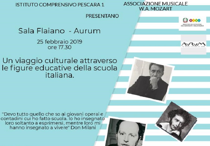 Si svolgerà lunedì 25 febbraio alle ore 17,30 all’Auditorium Flaiano “Un viaggio culturale attraverso le figure educative della scuola italiana”, evento promosso dall’Associazione Accademica Musicale “W. A. Mozart” di Pescara, in collaborazione con l’Istituto Comprensivo Pescara 1 e con il patrocinio del Comune di Pescara. Si tratta di un evento di importante valenza culturale e pedagogica, che coinvolge i dirigenti scolastici delle scuole pubbliche di Pescara e aperto alla città, sull’importanza di esempi della pedagogia e della cultura quali Don Milani, Gianni Rodari, Ugo Foscolo e Iqbal Masiq che danno nome ai plessi del Comprensivo.
