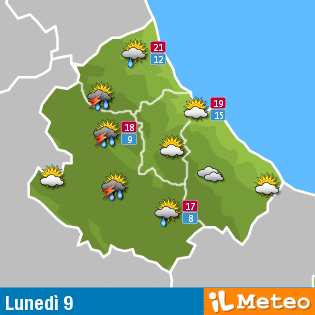 Nel chietino, molto nuvoloso o coperto. I venti saranno prevalentemente deboli e soffieranno da EST con intensità di 7 km/h. Possibili raffiche fino a 10 km/h. Temperatura minima di 9 °C e massima di 19 °C. Quota 0°C a 2600 metri.
