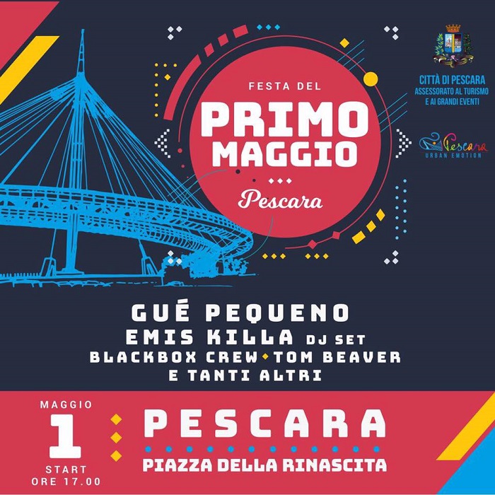 “Al via il primo evento della stagione Estiva. Si parte – dice l’assessore comunale ai grandi eventi, Giacomo Cuzzi, con il grande Concerto del Primo Maggio con due super artisti: Guè Pequeno ed Emis killa. Una giornata tutta da vivere nella nostra bella Città. Vi aspettiamo, buon weekend e buona Pescara a tutti.”