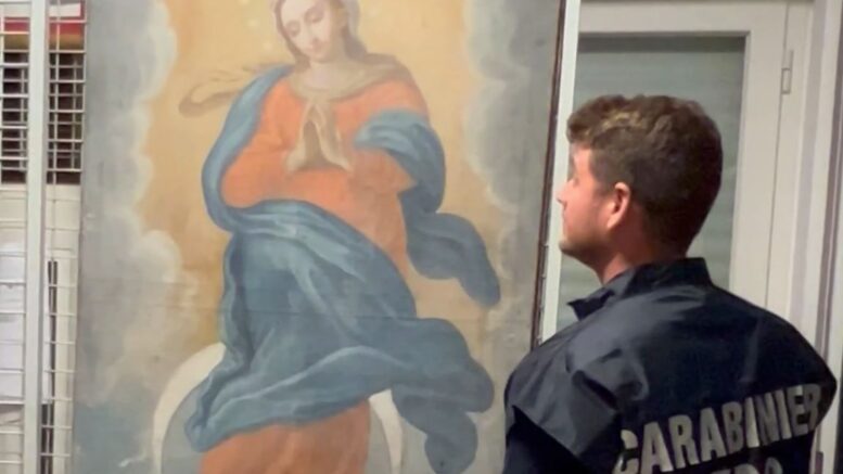3) La restituzione di un dipinto raffigurante l’immacolata concezione alla parrocchia di San Paolo Apostolo di Fiamignano (RI), un antico dipinto risalente al XVIII secolo, proveniente dall’omonima chiesa e andato perso da circa trent’anni. La tela era stata rinvenuta fortuitamente a L’Aquila da un privato, il quale, notando la bellezza del dipinto, ha contattato i Carabinieri del Nucleo Tutela Patrimonio Culturale dell’Aquila.