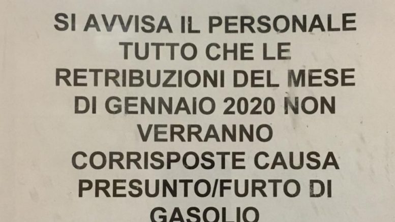 Sull’avviso si legge: “si avvisa il personale tutto che le retribuzioni del mese di gennaio 2020 non verranno corrisposte causa presunto furto di gasolio”.