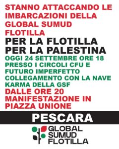 Oggi alle ore 18.00 a Pescara collegamento in diretta con un’imbarcazione della Global Sumud Flotilla, alle 20 manifestazione in piazza Unione