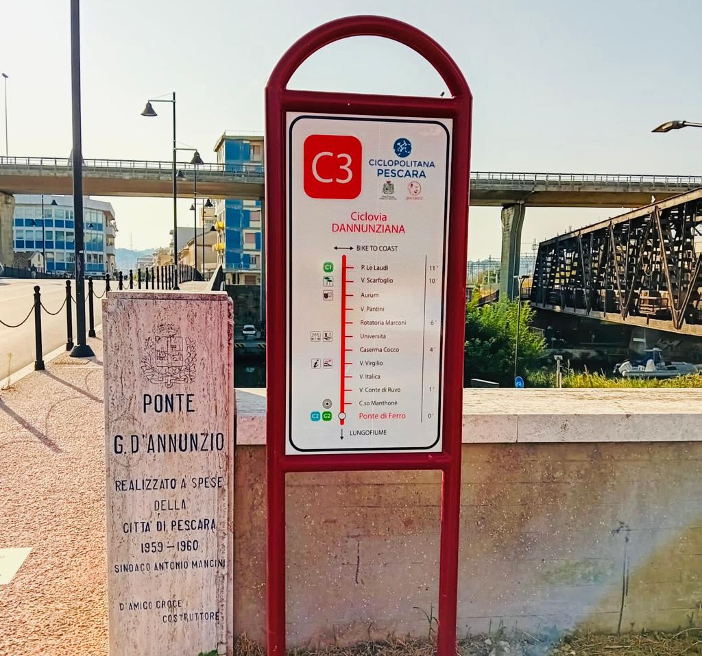 Le tabelle, con differenti colorazioni, indicano i diversi percorsi: blu petrolio per il tratto urbano della Bike to coast che collega Pescara a nord con Montesilvano e a sud con Francavilla, rosso per la ciclovia Dannunziana che ha tra gli attrattori la zona uffici di via Conte di Ruvo, l’Aurum e l’università, verde per la Greenway del lungofiume, verde acceso per la ciclovia mare-università, turchese per la ciclovia dei parchi e fucsia per la circonvallazione-Pendolo. Tutti i percorsi sono integrati con la ciclabilità regionale che porta verso San Salvo e Martinsicuro e anche nei centri vicini, con relativa indicazione delle distanze chilometriche da percorrere