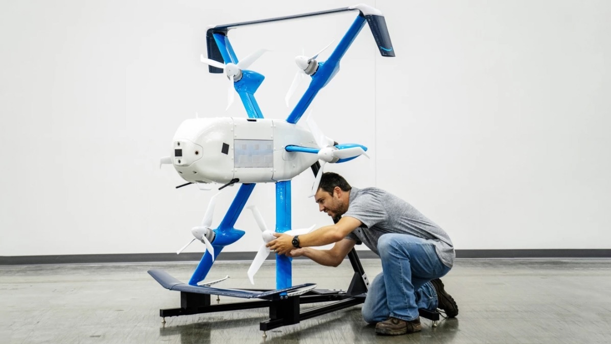È un drone che pesa poco più di 36 chilogrammi, ha un raggio d’azione complessivo di 24 km, tra andata e ritorno, e può consegnare pacchi fino a 2 kg e mezzo circa, un peso che include il 90% degli articoli venduti da Amazon.