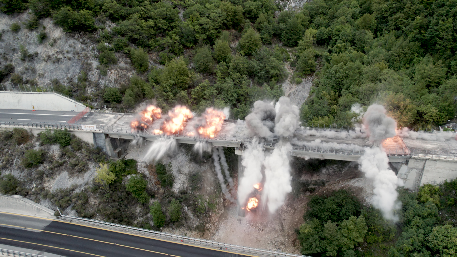 Proseguono le demolizioni di ‘Strada dei Parchi’, tra le uscite di Tornimparte e L’Aquila Ovest. Questa mattina le microcariche esplosive hanno fatto brillare la carreggiata Est, in direzione Teramo, del Viadotto Cerqueta.