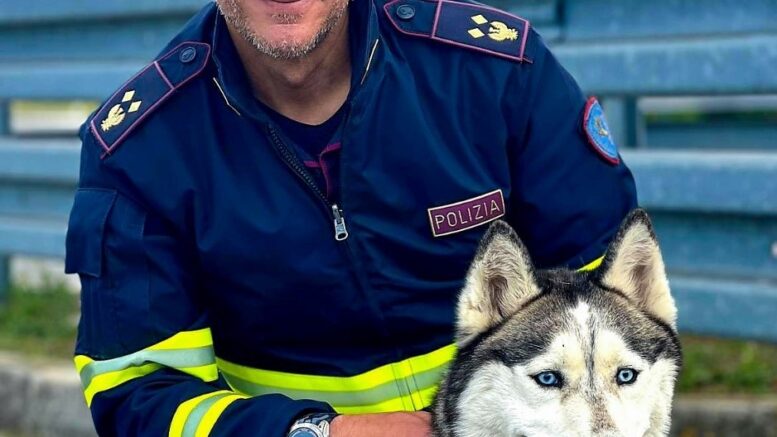 Si è conclusa nel migliore dei modi la “scampagnata” di un husky scappato di casa e trovato in prossimità del casello autostradale di Villanova in A25 ieri pomeriggio: nella foto Maya e il poliziotto che l’ha salvata