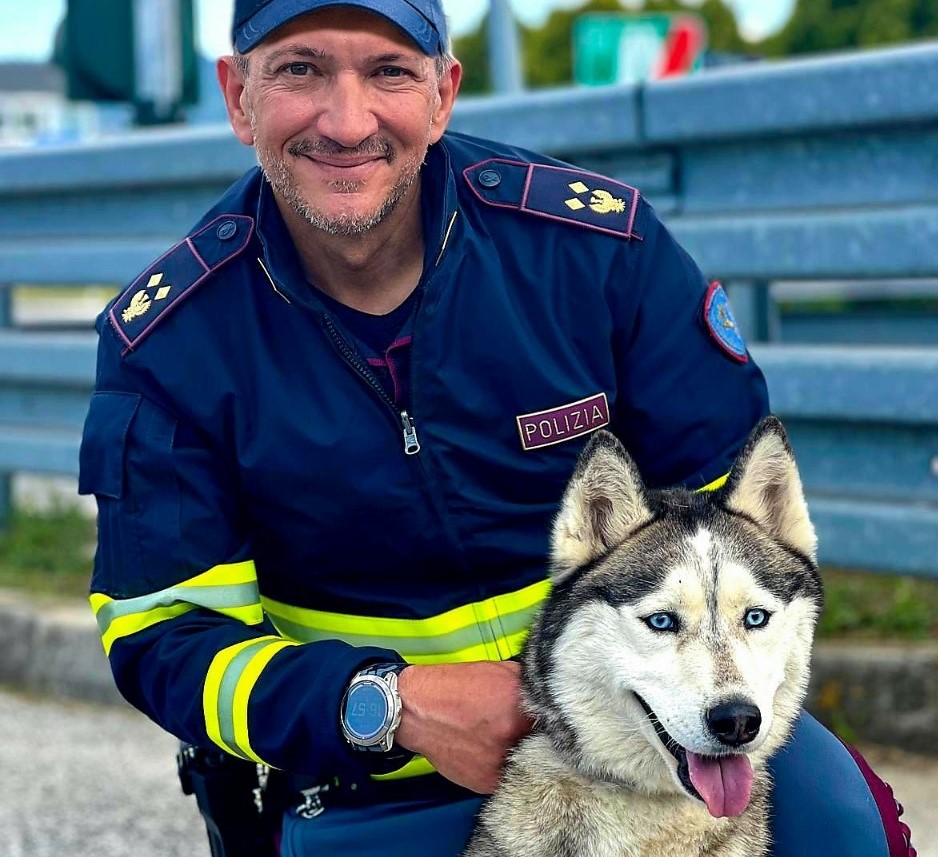 Si è conclusa nel migliore dei modi la “scampagnata” di un husky scappato di casa e trovato in prossimità del casello autostradale di Villanova in A25 ieri pomeriggio: nella foto Maya e il poliziotto che l’ha salvata