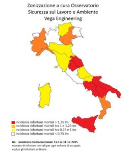 A finire in zona rossa a dicembre 2025, con un’incidenza superiore a +25% rispetto alla media nazionale (Im=Indice incidenza medio, pari a 33,3 morti sul lavoro ogni milione di lavoratori) sono: Basilicata, Campania, Umbria, Puglia, Sicilia e Marche. In zona arancione: Liguria, Calabria, Piemonte e Veneto. In zona gialla: Trentino-Alto Adige, Emilia-Romagna, Abruzzo, Sardegna, Toscana e Molise. In zona bianca: Lazio, Lombardia, Friuli-Venezia Giulia e Valle d’Aosta.