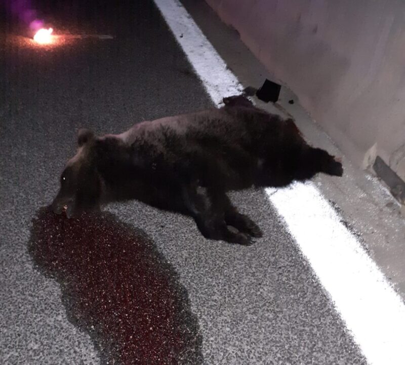 Questa notte alle ore 3:00 circa è stato investito un orso bruno marsicano sulla carreggiata della A25 in direzione Pescara al Km 94+700 ricompreso tra gli svincoli di Avezzano e Celano.