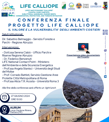 L’appuntamento è a Pescara, domani 27 giugno, con i biologi, gli esperti ed i tecnici che hanno partecipato al progetto LIFE Calliope, acronimo di ‘Coastal dune habitats, sublittoral sandbanks, marine reefs: conservation, protection, and threats mitigation’ (info al link https://lifecalliope.eu/), per illustrare e divulgare risultati e finalità dell’iniziativa.