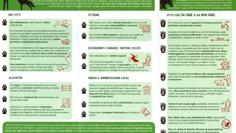 L’opuscolo contiene diversi consigli su che cosa fare e non fare quando ci si imbatte in un animale selvatico in difficoltà (in particolare uccelli e cuccioli di mammiferi) e anche come comportarsi nel caso si incontri un lupo o un orso nelle aree montane in cui vivono gli ultimi individui della preziosa sottospecie Ursus arctos marsicanus.