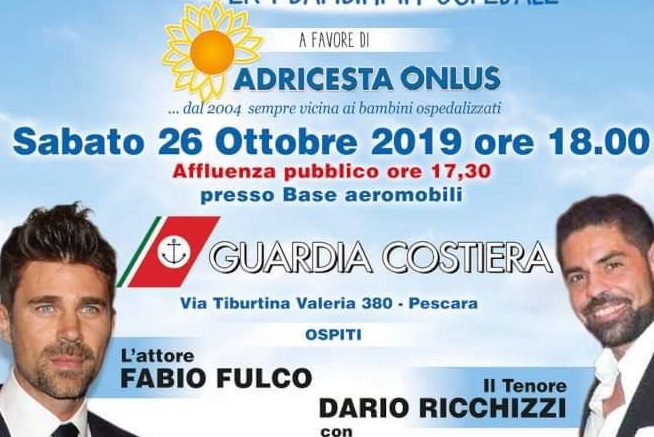 “Voliamo con la Solidarietà”, l’iniziativa dell’ADRICESTA e della sua presidente, Carla Panzino, si è tenuta al Nucleo Aereo e Sezione Volo Elicotteri della Guardia Costiera di Pescara, Aeroporto Militare. Ospite d’eccezione l’attore Fabio Fulco, che ha letto alcuni brani con il tenore Dario Ricchizzi che ha cantato pagine musicali note, accompagnato dal Coro dei bambini dell’Istituto Comprensivo Pescara 8. La serata è stata condotta da Luca Pompei. L’attore Fabio Fulco, il giorno dopo, ha fatto visita ai Reparti di Chirurgia pediatrica, Pediatria e Oncologia pediatrica, per salutare i bambini degenti e i loro genitori. Il progetto, che si inaugurerà a gennaio 2020, prevede la dotazione di arredi per il reparto pediatrico di Pescara, con lettini pediatrici, culle neonatali, armadi, tavoli, comodini, sedie e decorazioni colorate, per renderlo più allegro ed accogliente.