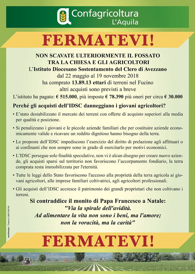Confagricoltura L’Aquila ha fatto affiggere un manifestato nel quale denuncia che l’Istituto diocesano di sostentamento del clero della curia di Avezzano ha speso oltre 600 mila euro per l’acquisto di quasi 14 ettari di terreni nel Fucino, nella Marsica, al solo scopo speculativo. Il manifesto è stato affisso in tutti i comuni del Fucino per segnalare alla popolazione – si legge in una nota dell’associazione “un fenomeno che va avanti dal qualche mese da parte dell’Istituto Diocesano a danno dell’intero sistema agricolo del Fucino”.