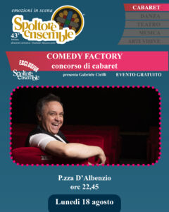 La serata proseguirà poi alle ore 22:45 in piazza D’Albenzio con la Comedy Factory di Gabriele Cirilli ed il suo “CAT” ossia la Casa di Accoglienza per Talenti, format ideato in esclusiva per lo Spoltore Ensemble per scovare nuovi talenti nel panorama artistico italiano. L’evento si articolerà in tre serate (18-20 agosto) di selezione da parte del pubblico presente in platea e culminerà con un grande show finale il 21 agosto.