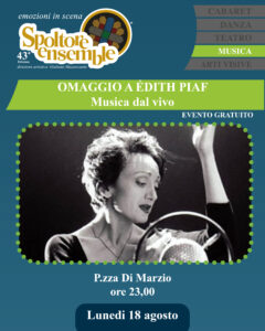 L’omaggio a Edith Piaf, con musica dal vivo, alle ore 23.00 in piazza Di Marzio, chiuderà la serata.