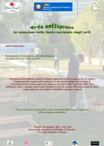Venerdì 10 sarà una giornata speciale, tutta dedicata all’orto, con laboratori creativi sullo spreco. Alunne e alunni potranno seguire le lezioni nella nuova aula outdoor dove l’ambiente, il territorio, il verde, la natura diventano coprotagonisti del processo educativo, in continuità con l’apprendimento in aula. Anche l’istituto comprensivo Pescara1, in collaborazione con Slow Food Pescara e Scienza under 18 Pescara per l’Abruzzo, è coinvolto nella Festa nazionale degli Orti a Scuola e nella valorizzazione della biodiversità: si parte venerdì 10 novembre 2023, presso l’orto della scuola secondaria Ugo Foscolo, alle ore 9:30. Il tema di quest’anno è la lotta allo spreco e alla povertà alimentare.