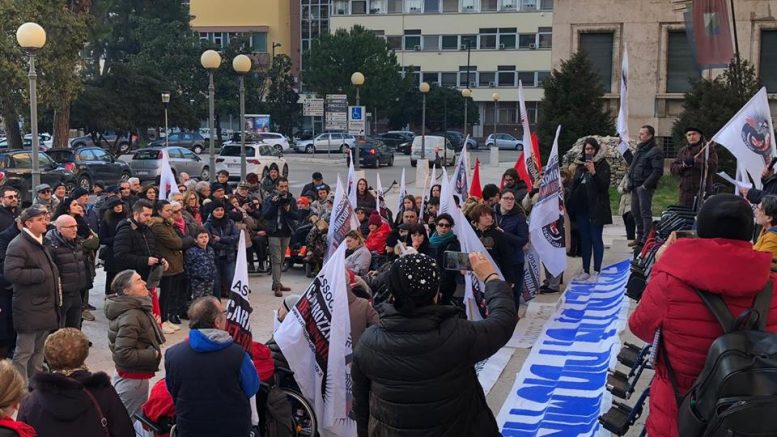 “Manifestazione super riuscita!”. Esulta Claudio Ferrante, dell’associazione “Carrozzine determinate” per la partecipazione sotto la Prefettura di Pescara di centinaia di persone, tantissime carrozzine. “Abbiamo voluto dire al governo che siamo disabili, ma non cretini e che non ci facciamo ingannare di chi si prende gioco degli esseri umani che soffrono”. Le pensioni di invalidità “in base alle promesse, sarebbero dovute aumentare a 780 euro al mese. Invece sono aumentate di 3 euro e 11 centesimi. Una persona invalida al 100% percepisce €286 di pensione al mese, cioè il 300% sotto la soglia di povertà”.