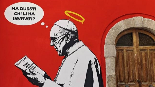 Il murale apparso a Borgo Universo raffigura Papa Francesco in paradiso, con aureola e sguardo contrariato, intento a leggere la lista dei partecipanti al suo funerale. Nel fumetto si legge “Ma questi chi li ha invitati?” riferendosi ai presenti al suo funerale.