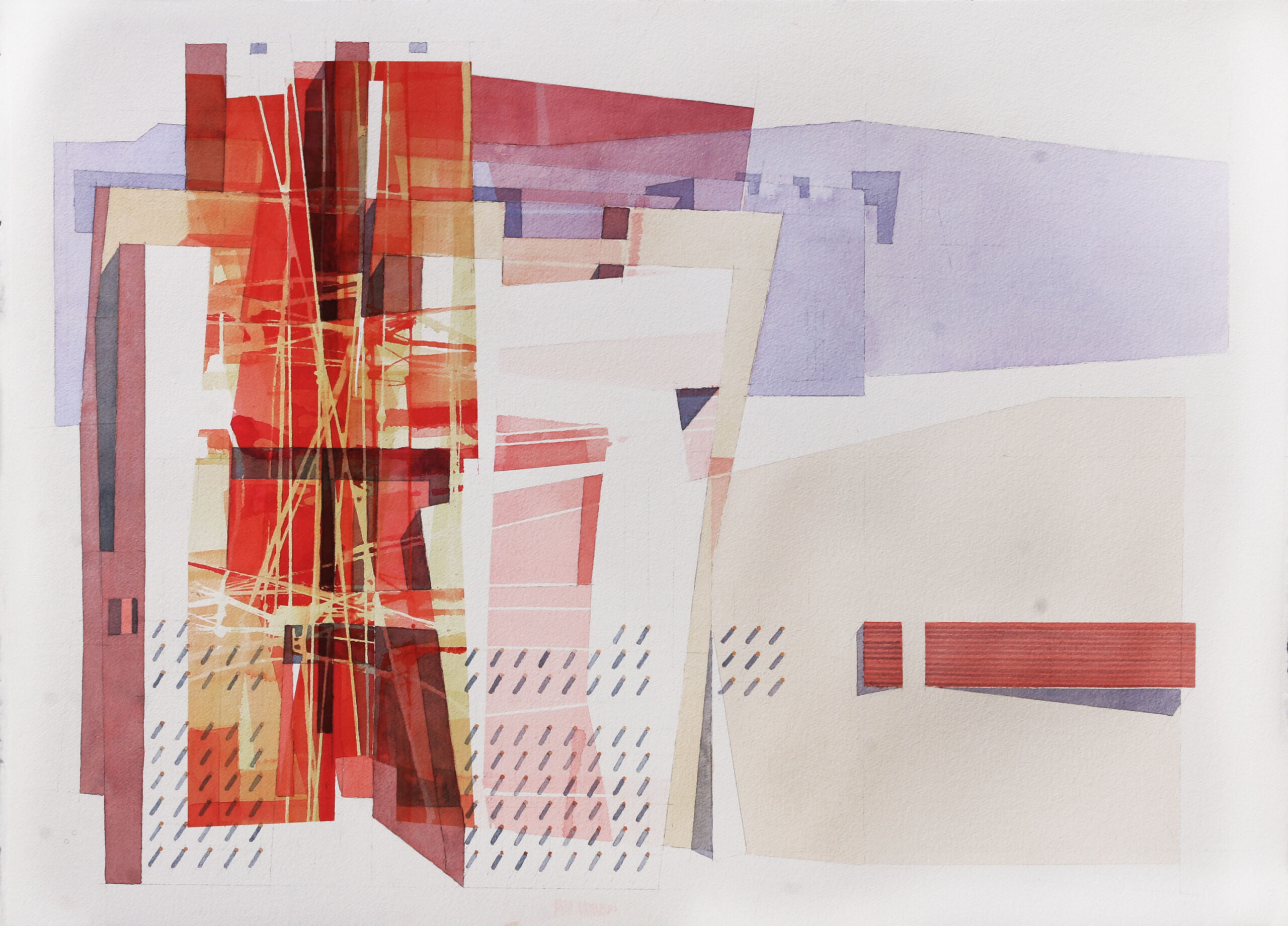 Si tratta di sei acquerelli che rimandano ad un’idea di città, un paesaggio urbano contemporaneo in parte reale, in parte in divenire, con una serie di striature come flussi di energia pura. Il riferimento non può che essere alla Nuova Pescara, il grande progetto di fusione tra i Comuni di Pescara, Montesilvano e Spoltore, e per il quale Sonsini, in qualità di architetto, ha redatto un dettagliato studio commissionato dall’associazione “Nuova Pescara”. Ciò che traspare è anche il concetto del cambiamento, tipico delle città moderne, soggette a trasformazioni imposte da una serie di fattori come quello della migrazione, dello smart working o della transizione ecologica: