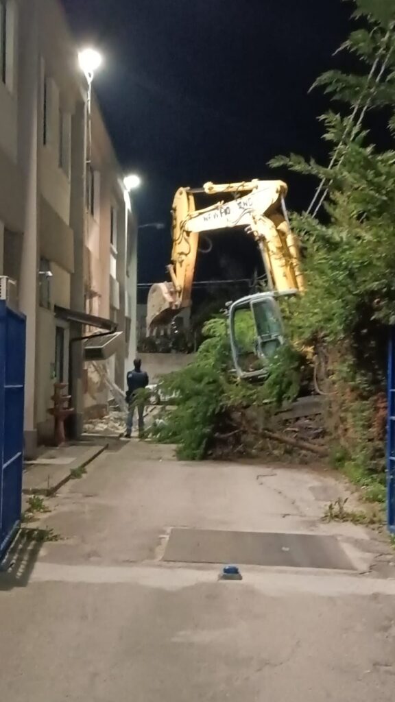 Davanti all’ingresso dell’IVRI si trova una grossa ruspa usata dai banditi per sventrare il caveau.