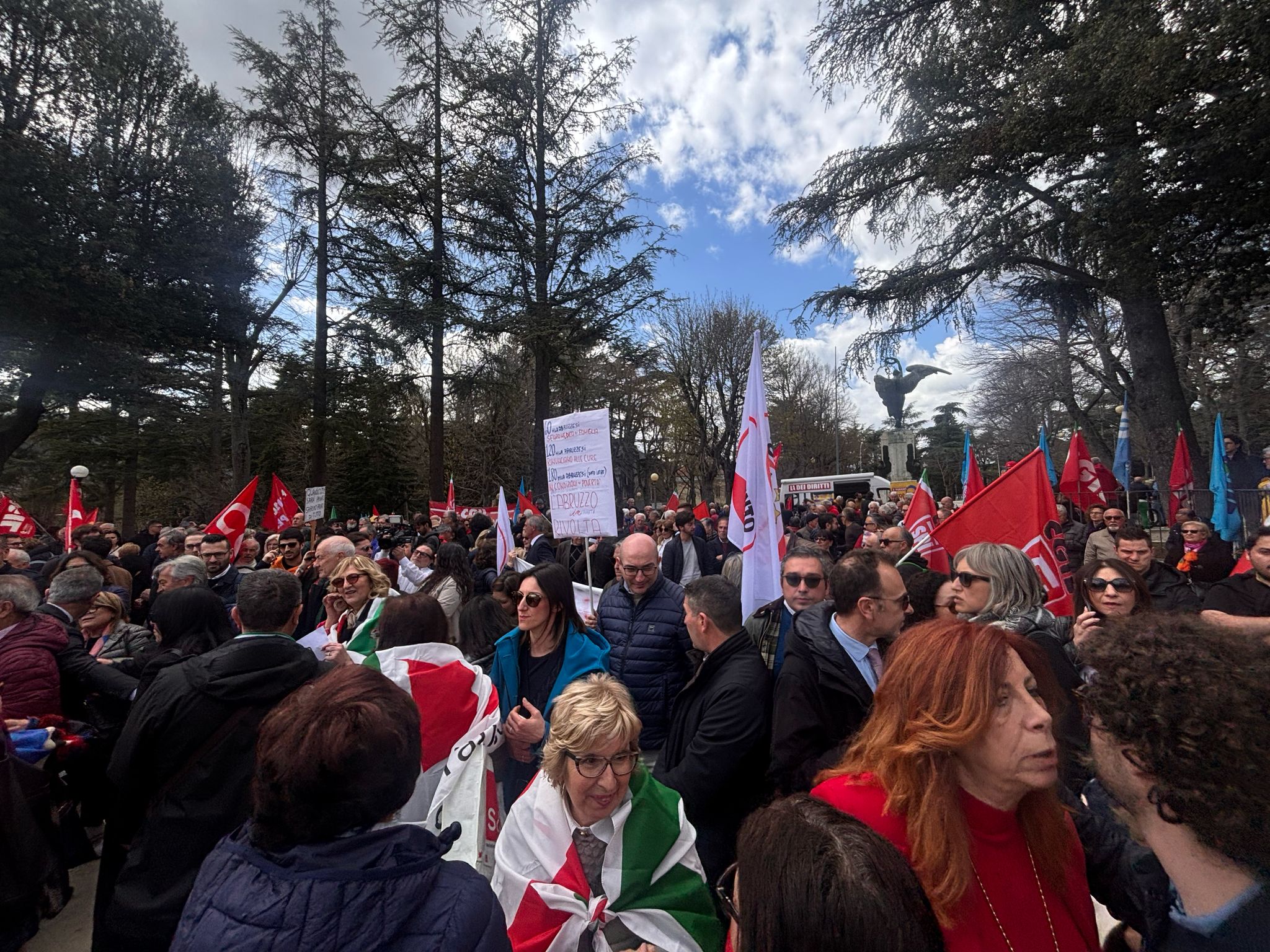 Tante le bandiere che sventolano, non solo quelle dei sindacati Cgil, Cisl, Uil e Ugl, ma anche dei vari partiti che compongono la coalizione Patto per l’Abruzzo.