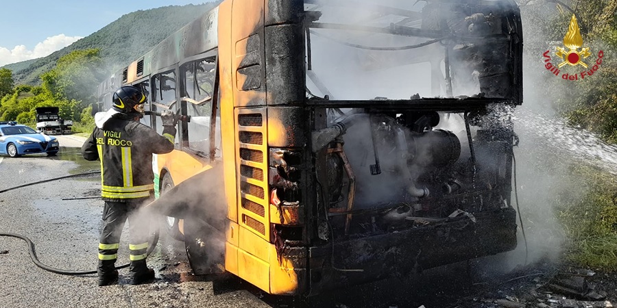 L’autista, accortosi delle fiamme, ha subito fermato il mezzo e ha fatto scendere i passeggeri. I Vigili del fuoco del distaccamento di Avezzano, tempestivamente sopraggiunti con due autobotti hanno spento l’incendio, ormai in uno stadio avanzato, e messo in sicurezza l’area.