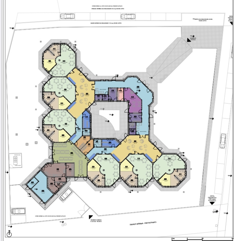 Il “cuore” pulsante della struttura, infine, sarà rappresentato dalle piazze, veri centri funzionali della scuola e aree aggregative su cui si andranno ad affacciare le aule. Le piazze fungeranno da aree per l’attività motoria, e da luoghi d’incontro: affianco a loro, prenderanno vita anche i vari laboratori, in un rapporto di reciproco e dinamico interscambio.