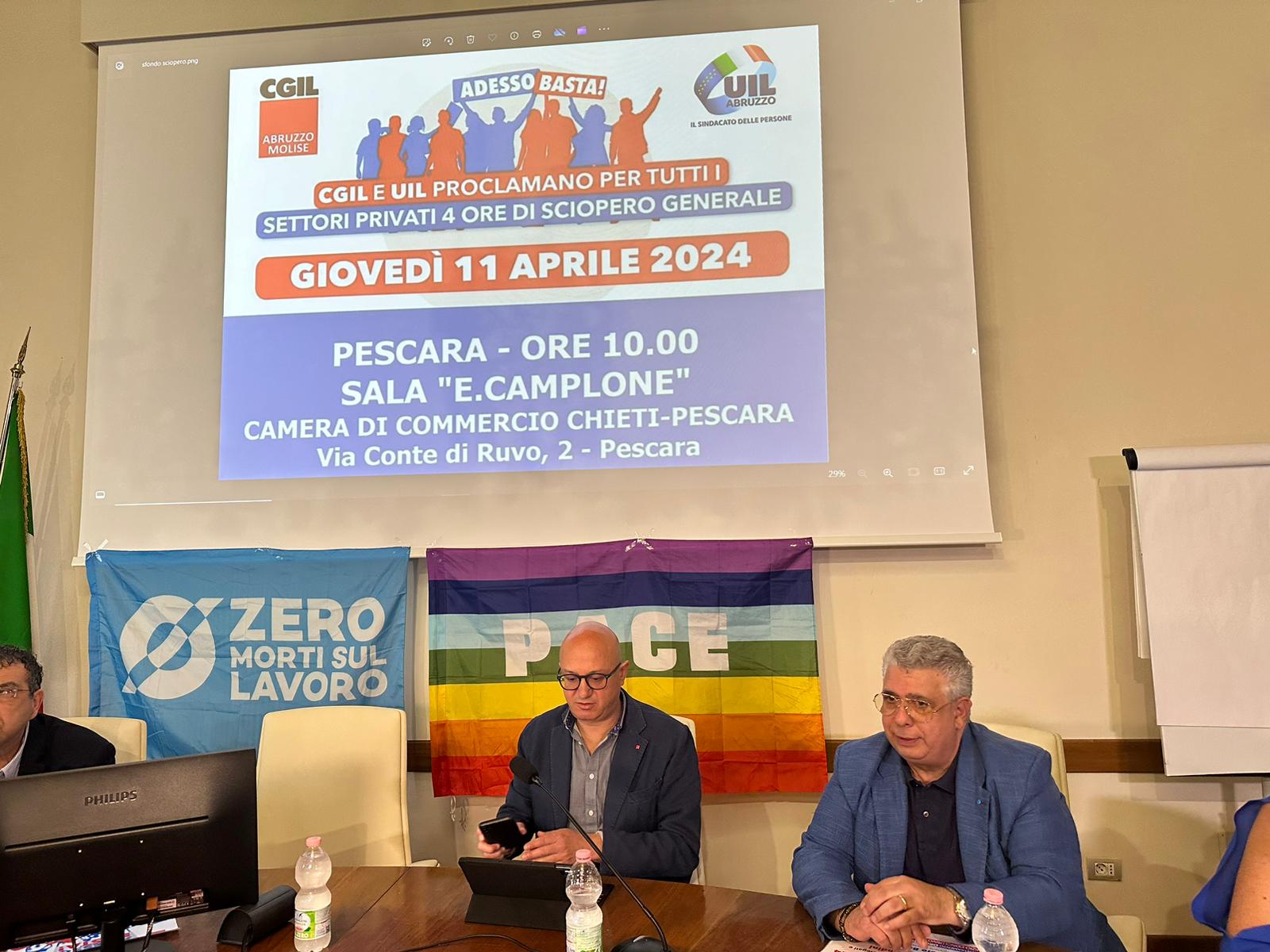 Zero morti sul lavoro, giusta riforma fiscale, cona una più equa distribuzione dell’Irpef, a carico prevalentemente di lavoratori e pensionati, un nuovo modello sociale e di fare impresa. Queste le rivendicazioni di Cgil e Uil che oggi, a livello nazionale, ma anche locale ha indetto uno sciopero di 4 ore, spiegando nel dettaglio le motivazioni in un’affollata conferenza stampa presso la Camera di Commercio di Chieti-Pescara. Sul tema del lavoro e della sicurezza, i sindacati tornano a chiedere la cancellazione delle leggi che negli anni hanno reso il lavoro precario e frammentato; il superamento del subappalto a cascata e il ripristino della parità di trattamento economico e normativo per le lavoratrici e i lavoratori di tutti gli appalti pubblici e privati; maggiori attività di vigilanza e prevenzione, incrementando le assunzioni nell’Ispettorato del Lavoro e nelle Aziende Sanitarie Locali; un’adeguata formazione e il diritto alla formazione continua per tutte le lavoratrici e i lavoratori; la patente a punti, per tutte le aziende e per tutti i settori, che blocchi le attività alle imprese che non rispettano le norme di sicurezza; il diritto delle lavoratrici e dei lavoratori di eleggere in tutti i luoghi di lavoro i propri rappresentanti dei lavoratori per la sicurezza; l’obbligo delle imprese ad applicare i CCNL di settore firmati dalle organizzazioni comparativamente più rappresentative ed al rispetto delle norme sulla sicurezza, quali condizioni per poter accedere a finanziamenti e incentivi pubblici. Altro argomento caldo dell’agenda sindacale firmata da Cgil e Uil è la necessità di una giusta riforma fiscale. I punti sono la riduzione della tassazione sul lavoro dipendente e sui pensionati, la tassazione delle rendite e il contrasto all’evasione; la promozione di un fisco progressivo abolendo la flat tax ed estendendo la base imponibile dell’Irpef a tutti i redditi; l’indicizzazione all’inflazione reale delle detrazioni da lavoro e da pensione e la detassazione degli aumenti contrattuali. Infine diventa necessario, secondo Cgil e Uil, rimettere al centro delle politiche economiche e sociali del governo e delle imprese il valore del lavoro – a partire dal rinnovo dei contratti nazionali e da una legge sulla rappresentanza – , la centralità della salute e della persona, la qualità di un’occupazione stabile e non precaria, una seria riforma delle pensioni, il rilancio degli investimenti pubblici e privati per riconvertire e innovare il sistema produttivo e puntare alla piena e buona occupazione a partire dal Mezzogiorno.