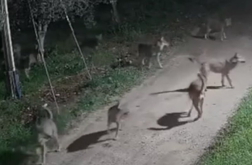 Il branco si trovava fuori dalla proprietà recintata, al cui interno c’era un cane che abbaiava agitato. Le immagini confermano le numerose segnalazioni giunte nelle ultime settimane sull’aumento della presenza dei lupi nelle campagne vicine ai centri abitati.