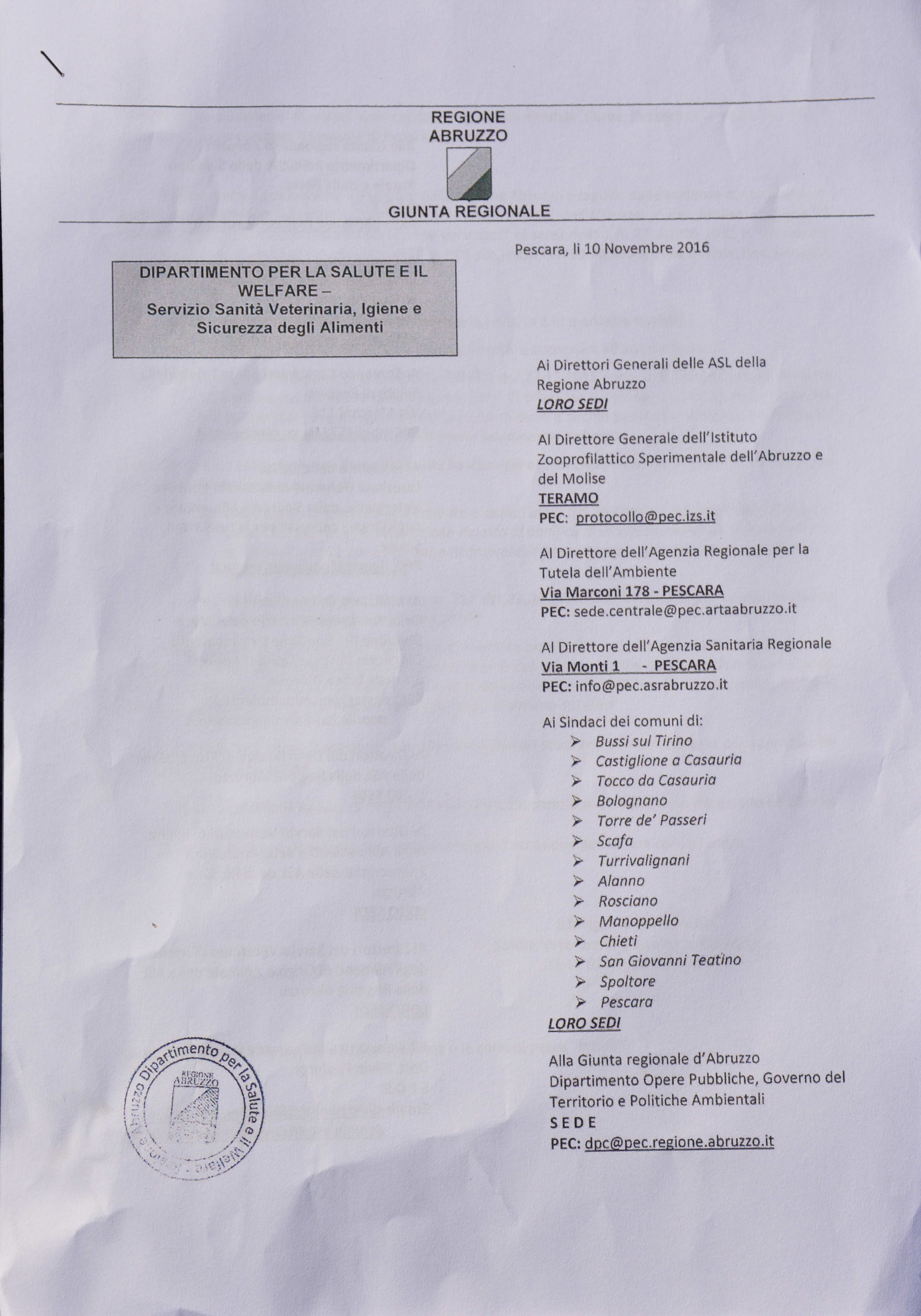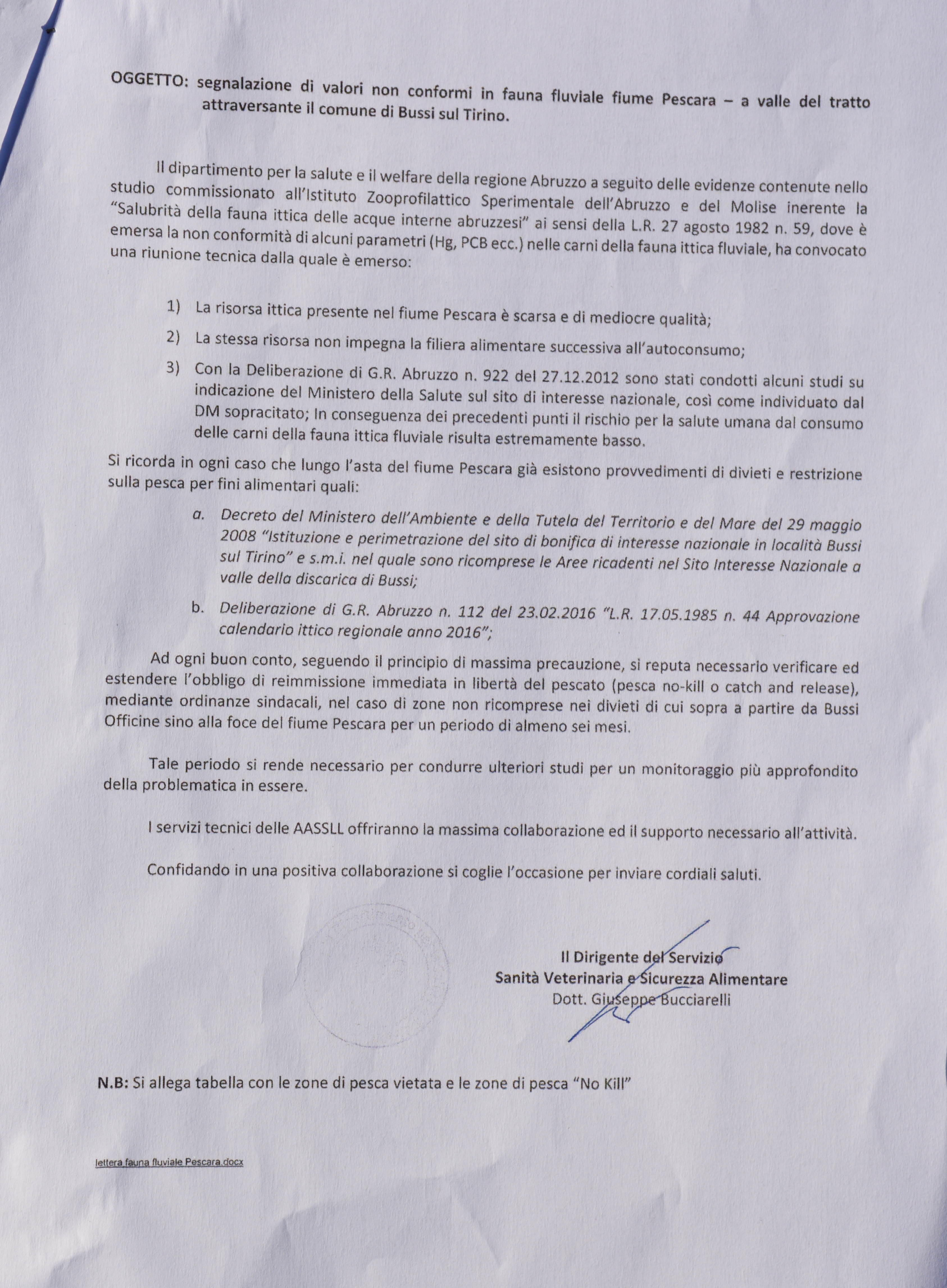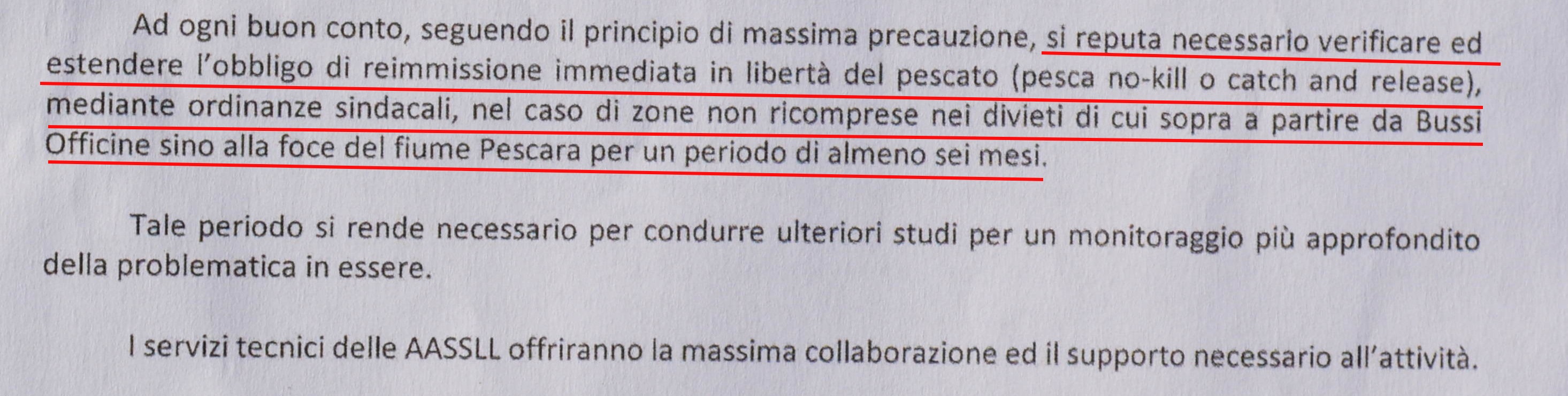 Nella nota del 10 novembre scorso che il Forum H2O divulga, a firma del responsabile dell’Ufficio Sanità veterinaria Bucciarelli, si richiede di estendere il divieto al resto del fiume da Bussi alla foce per un arco temporale di almeno sei mesi in attesa di ulteriori approfondimenti.