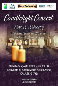 L’evento “Candlelight concert”, a ingresso libero, avrà inizio alle 21. Il Coro Saverio Selecchy di Chieti è diretto dal maestro Mariarita D’Orazio e accompagnato al pianoforte dal maestro Mimmo Speranza.
