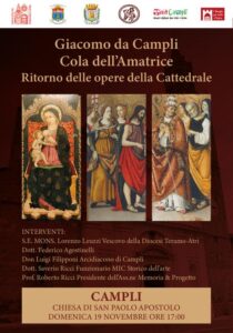 Le opere, la Madonna del Latte di Giacomo da Campli (XV sec.) e due tavole dipinte da Nicola Filotesio, detto Cola dell’Amatrice, (XVI sec.), saranno esposte, da domenica 19 novembre, nella Chiesa di San Paolo a Campli, in attesa di essere ricollocate nella Cattedrale di Santa Maria in Platea al termine del restauro post sisma. La notizia del rientro delle opere d’arte camplesi, da tempo conservate presso i depositi della Soprintendenza Archeologia Belle Arti e Paesaggio per l’Abruzzo, è stata annunciata oggi durante la conferenza stampa di presentazione dell’evento. Il rientro della opere segue di qualche mese l’annuncio del Sottosegretario di Stato alla Cultura, Vittorio Sgarbi, che, ospite proprio a Campli del Festival culturale Farnesiana lo scorso luglio, aveva dichiarato il suo impegno affinché le opere del patrimonio artistico Farnese ritornassero nel loro luogo d’origine.