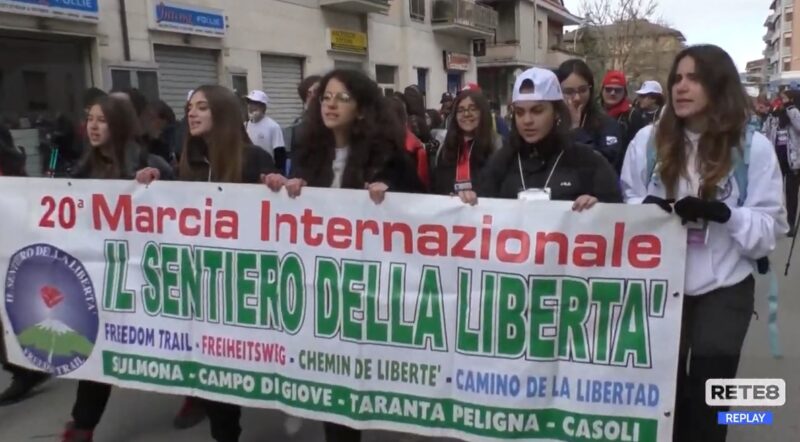 Fu Mario Setta a far rivivere anche nella scuola la cosiddetta Resistenza umanitaria, l’accoglienza che i sulmonesi e peligni offrirono ai prigionieri alleati, liberati dal Campo 78, a Fonte d’Amore, all’indomani dell’armistizio dell’otto settembre. In ricordo di quelle vicende il Sentiero, partendo da via Togliatti, davanti al monumento dedicato ai patrioti della Brigata Maiella, ha attraversato via Papa Giovanni XXIII e da via Fiume ha imboccato Porta Pacentrana, fermandosi per un momento in quel Borgo che diede ospitalità in tante case ai prigionieri, sfamati e alloggiati. Poi il cammino è ripreso alla volta di Campo di Giove, altro simbolo del Sentiero. Ad inaugurare il Sentiero è stata Franca Del Monaco, insegnante e compagna del professore Setta.