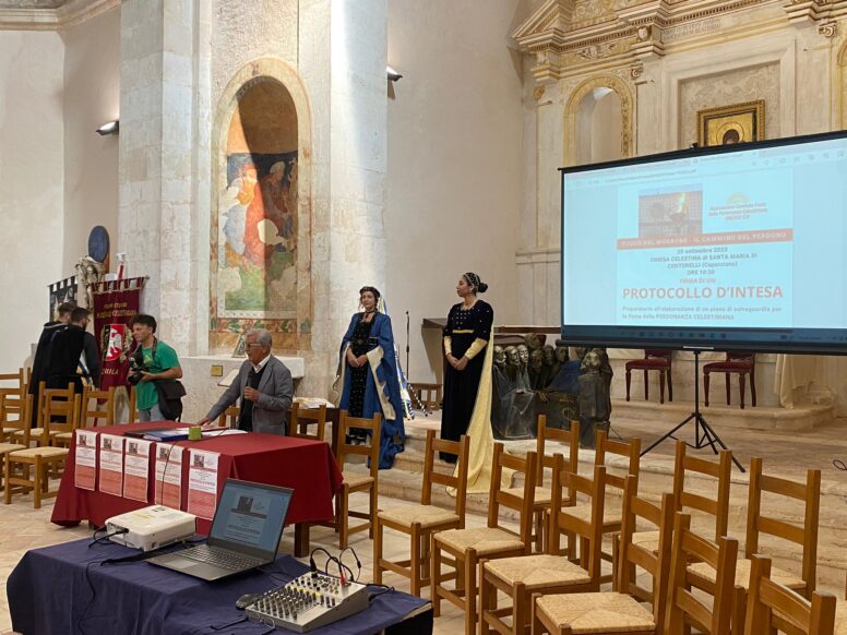 E’ stato firmato questa mattina nella chiesa celestina di Santa Maria di Centurelli, a Caporciano, un protocollo di intesa tra l’associazione comitato festa della Perdonanza Celestiniana e le associazioni e i comuni interessati dall’itinerario del fuoco del Morrone – Cammino del Perdono per l’elaborazione di un piano di salvaguardia per la festa della Perdonanza