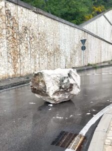 Le foto che vi mostriamo rendono perfettamente l’idea delle dimensioni del masso piombato sulla strada, poco dopo le 16.30. Un masso enorme che difficilmente avrebbe lasciato indenne un’auto di passaggio.