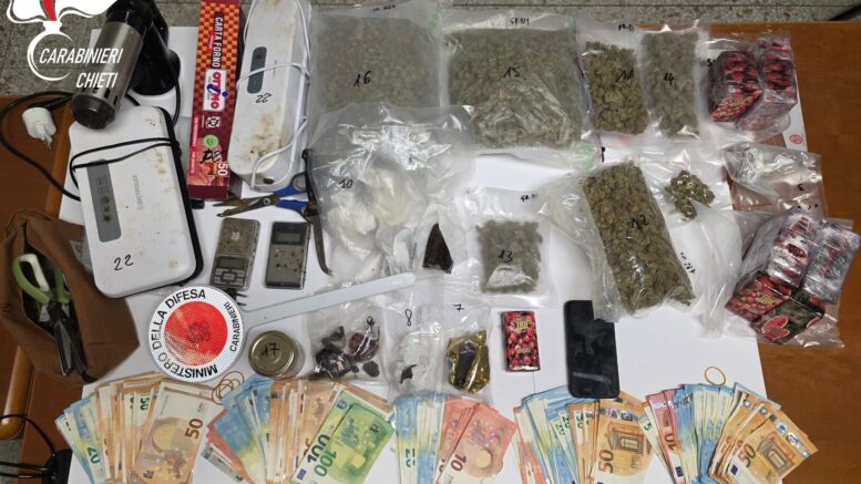 L’attività investigativa è poi proseguita con una perquisizione presso un garage in uso al ragazzo, sempre nel comune di Lanciano, dove i militari hanno scoperto un vero e proprio deposito di sostanze stupefacenti: 790 grammi di hashish; 300 grammi di marijuana; due bilancini di precisione; materiale per il confezionamento; 10.000 euro in contanti, ritenuti provento dell’attività illecita.