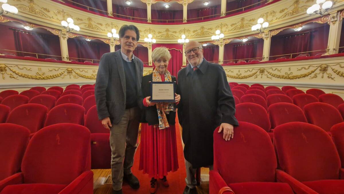 Il riconoscimento è stato consegnato da Giustino Angeloni, presidente della Deputazione teatrale Teatro Marrucino, e dal maestro Davide Cavuti, direttore della stagione di prosa.
