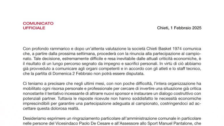 “Con profondo rammarico e dopo un’attenta valutazione la società Chieti Basket 1974 comunica che, a partire dalla prossima settimana, procederà con la rinuncia alla partecipazione al campionato. Tale decisione, estremamente difficile e resa inevitabile dalle attuali criticità economiche, è il risultato di un lungo percorso segnato da impegno e sacrifici personali. In virtù di ciò abbiamo già provveduto a comunicare agli organi competenti e in accordo con gli atleti e lo staff tecnico, che la partita di Domenica 2 Febbraio non potrà essere disputata.