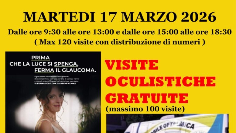 Controlli oculistici gratuiti in piazza San Giustino a Chieti per la settimana mondiale del glaucoma e distribuzione di opuscoli informativi. L’appuntamento è per domani, martedì 17 marzo, dalle ore 9:30 alle ore 12,30 ed è promosso dal consiglio regionale d’Abruzzo dell’Unione italiana ciechi e ipovedenti Ets e Aps unitamente alla fondazione Iapb